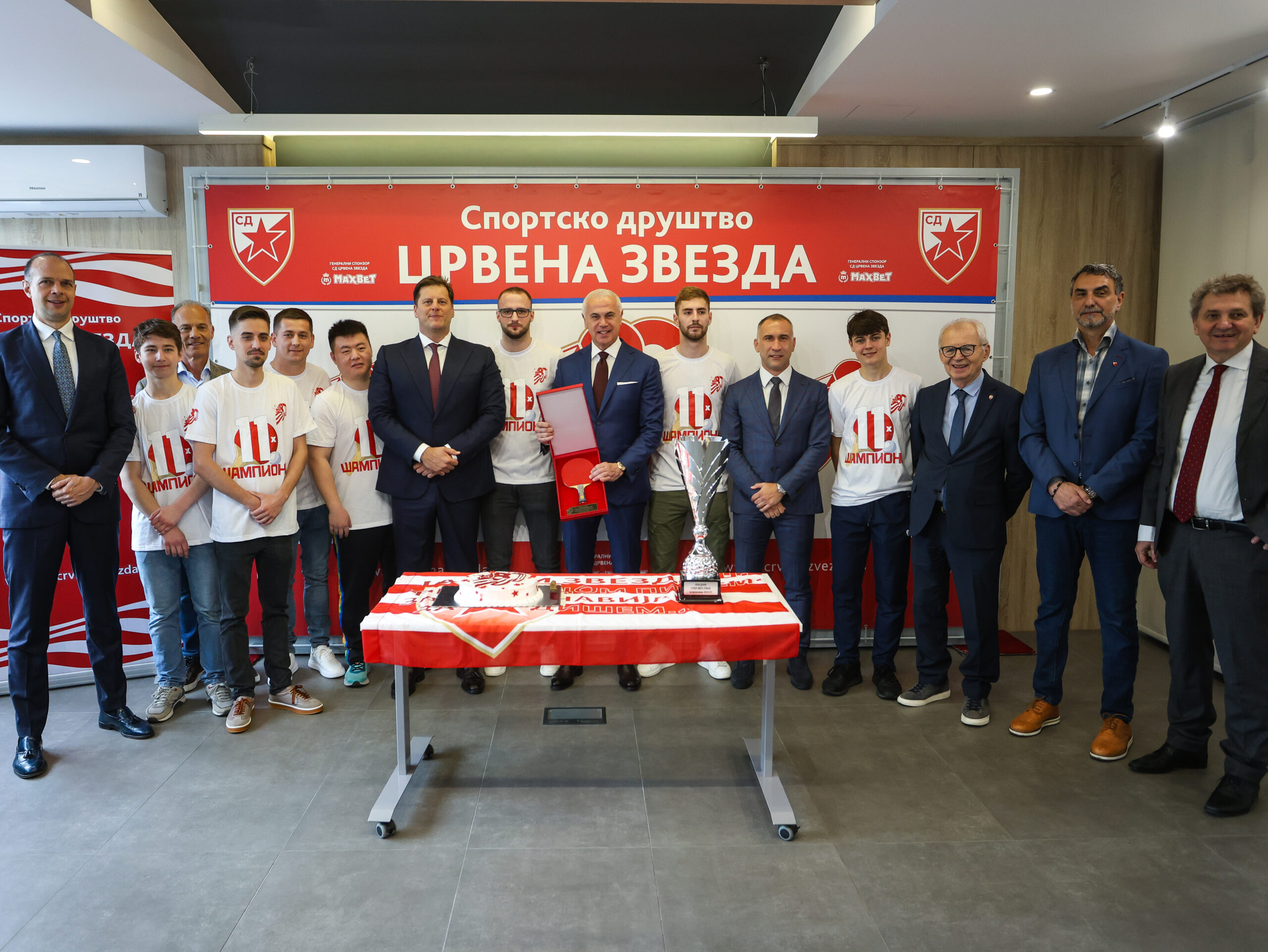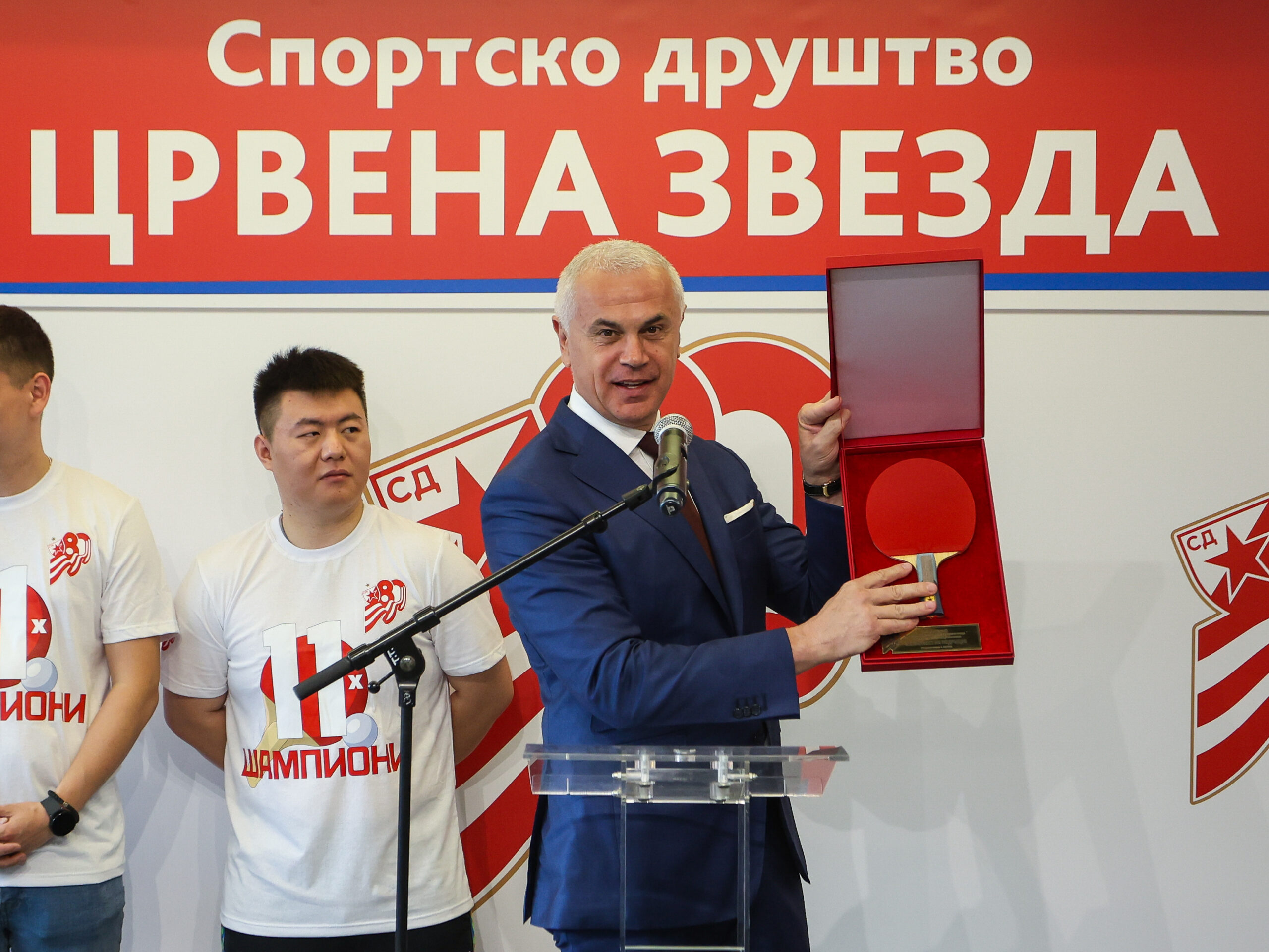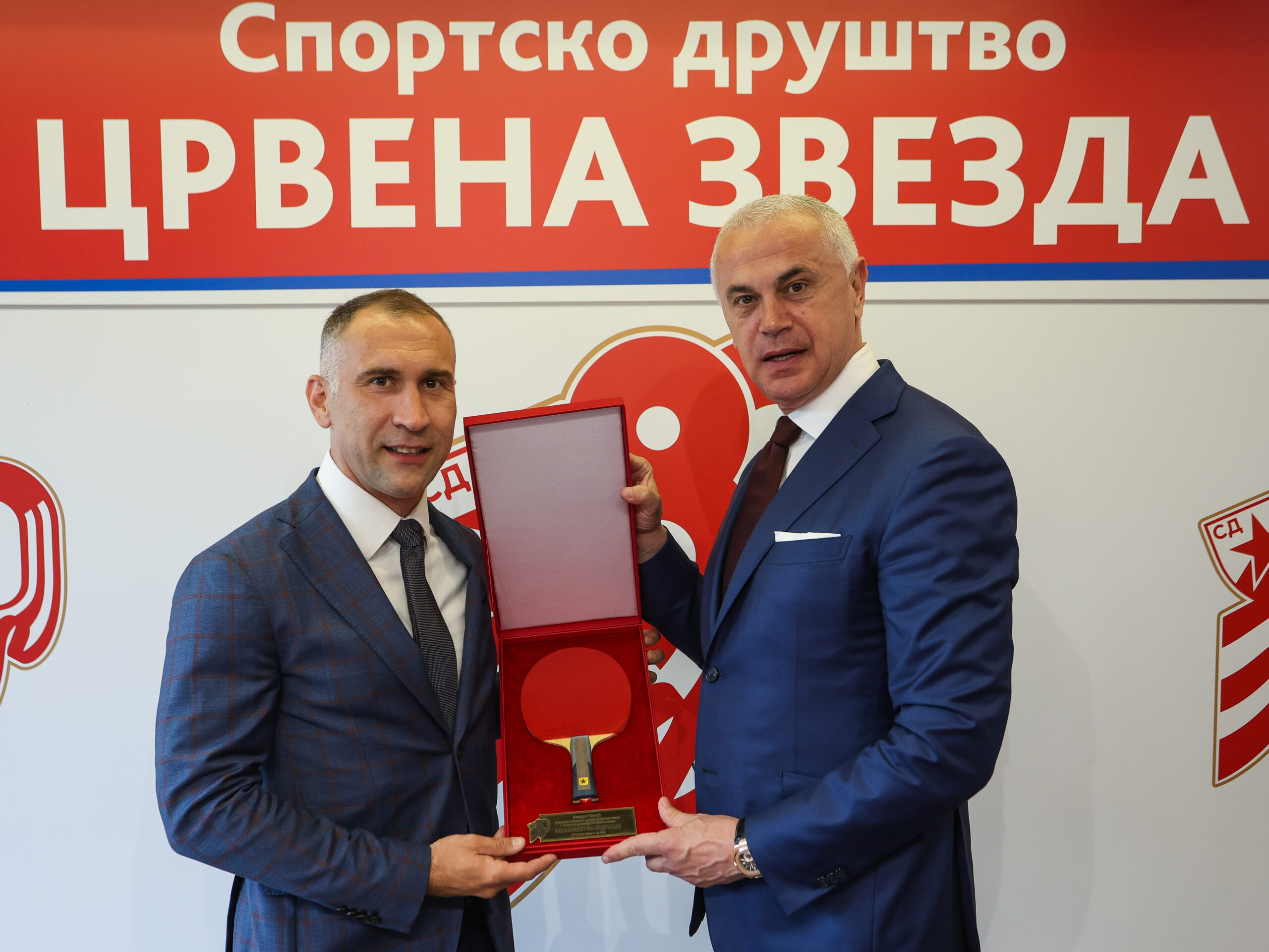 Специјални поклон Стонотениског клуба Црвена звезда, рекет којим су наши стонотенисери освојили титулу шампиона, Марко Јевтовић, директор клуба уручио је у знак захвалности Звездану Терзићу, председнику УО Спортксог друштва и генералном директору ФК Црвена звезда.