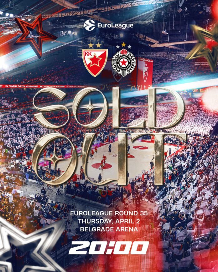 Утакмица 35. кола Евролиге између КК Црвена звезда Меридианбет и КК Партизан играће се пред пуним трибинама, пошто су све карте за ову утакмицу, укључујући и додатне контингенте и дефинитивно распродате!